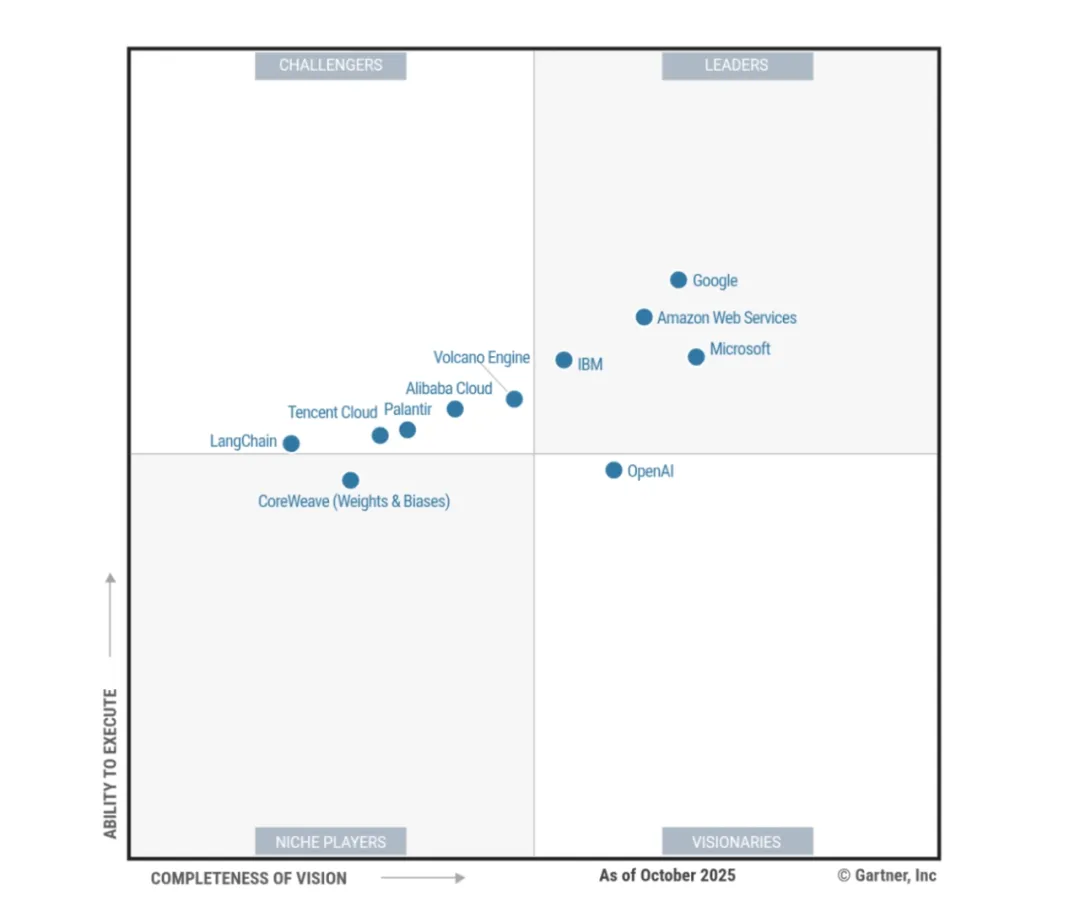 如前文所讲,Gartner MQ的象限图,从来都不是简单的排名游戏,而是全球科技产业竞争态势的微缩沙盘。以《AI应用开发平台魔力象限》为例,它背后揭露的信息,既在意料之中,又出乎许多人意料之外。