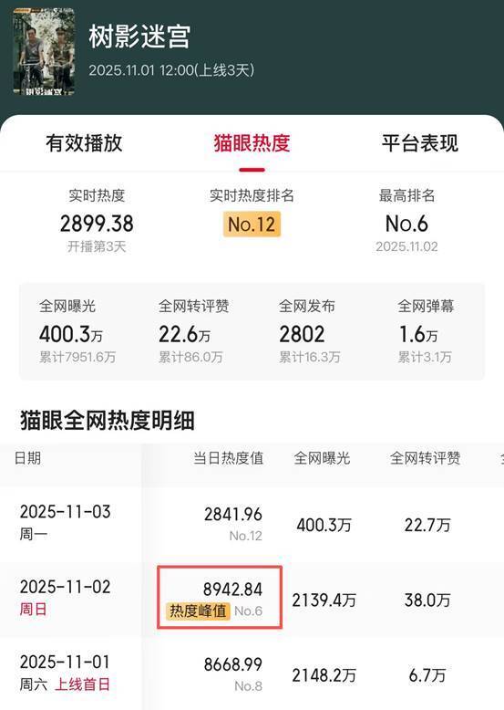 由廖凡、刘琳主演的《树影迷宫》上线,仅播6集,热度破8900,观众的追剧热情居高不下。